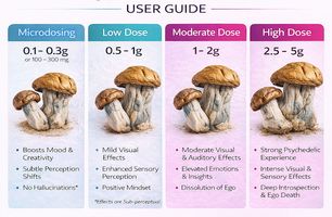 Psilocybe mushrooms, commonly referred to as magic mushrooms, contain psilocybin, a naturally occurring psychedelic compound. For centuries, these mushrooms have been used in various cultures for spiritual, healing, and recreational purposes. Recent research suggests that psilocybin may have therapeutic benefits for conditions such as depression, anxiety, PTSD, and substance use disorders. While the use of psilocybin is gaining recognition in clinical settings, it is essential to approach it with respect and caution. CORRECT DOSING Low and Moderate Doses Microdose: Typically 0.1 to 0.3 grams of dried mushrooms. This dose is sub-perceptual, meaning it doesn’t produce noticeable psychedelic effects but may enhance mood and creativity. Low Dose: 0.5 to 1 gram of dried mushrooms. Users may experience mild perceptual changes and enhanced emotional sensitivity. Moderate Dose: 1 to 2 grams. This range often induces more significant changes in perception and thought, along with introspective experiences. High Doses High Dose: 2.5 to 5 grams. At this level, users may experience profound alterations in consciousness, which can lead to intense emotional and visual experiences. This dosage should only be taken in a safe, supportive environment and ideally with a sober guide present. IMPORTANT NOTES ON DOSING Set and Setting: The mindset (set) and environment (setting) significantly impact the experience. Ensure you are in a safe, comfortable space and have a positive mental state. Individual Variability: Factors such as body weight, metabolism, and prior experience with psychedelics can influence how one responds to psilocybin. It’s advisable to start with a lower dose to gauge your sensitivity. Preparation: Consider fasting for several hours before taking psilocybin to enhance the experience, but stay hydrated. WARNINGS ON TAKING PSILOCYBE MUSHROOMS HEALTH CONDITIONS Mental Health Disorders: Individuals with a personal or family history of psychosis, schizophrenia, or bipolar disorder should avoid psilocybin, as it may exacerbate these conditions. Physical Health Concerns: Those with cardiovascular issues or other significant health concerns should consult a healthcare professional before use. MEDICATION INTERACTIONS Antidepressants: Taking psilocybin with SSRIs or other antidepressants can dull its effects. Consult with a healthcare provider for guidance. Other Medications: Be cautious of mixing psilocybin with medications that affect serotonin levels (e.g., MAOIs), as this can lead to serotonin syndrome, a potentially life-threatening condition. GENERAL PRECAUTIONS Supervision: For those inexperienced with psychedelics, it’s advisable to have a trusted, sober person present to help navigate the experience. Legal Status: Psilocybin is illegal in many jurisdictions. Familiarize yourself with local laws and regulations. Mental Preparedness: Ensure you are mentally prepared for the experience, as challenging emotions or thoughts may arise during the trip. AFTERCARE Integration: After the experience, consider reflecting on your insights. Talking to a therapist or participating in integration circles can be beneficial.
